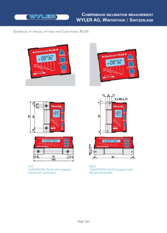 COMPENDIUM INCLINATION MEASUREMENT WYLER AG, WINTERTHUR / SWITZERLAND EXAMPLES OF SPECIAL OPTIONS FOR CLINOTRONIC PLUS Left: Right: CLINOTRONIC PLUS with magnetic CLINOTRONIC PLUS threaded holes inserts left and bottom M3 left and bottom Page 124